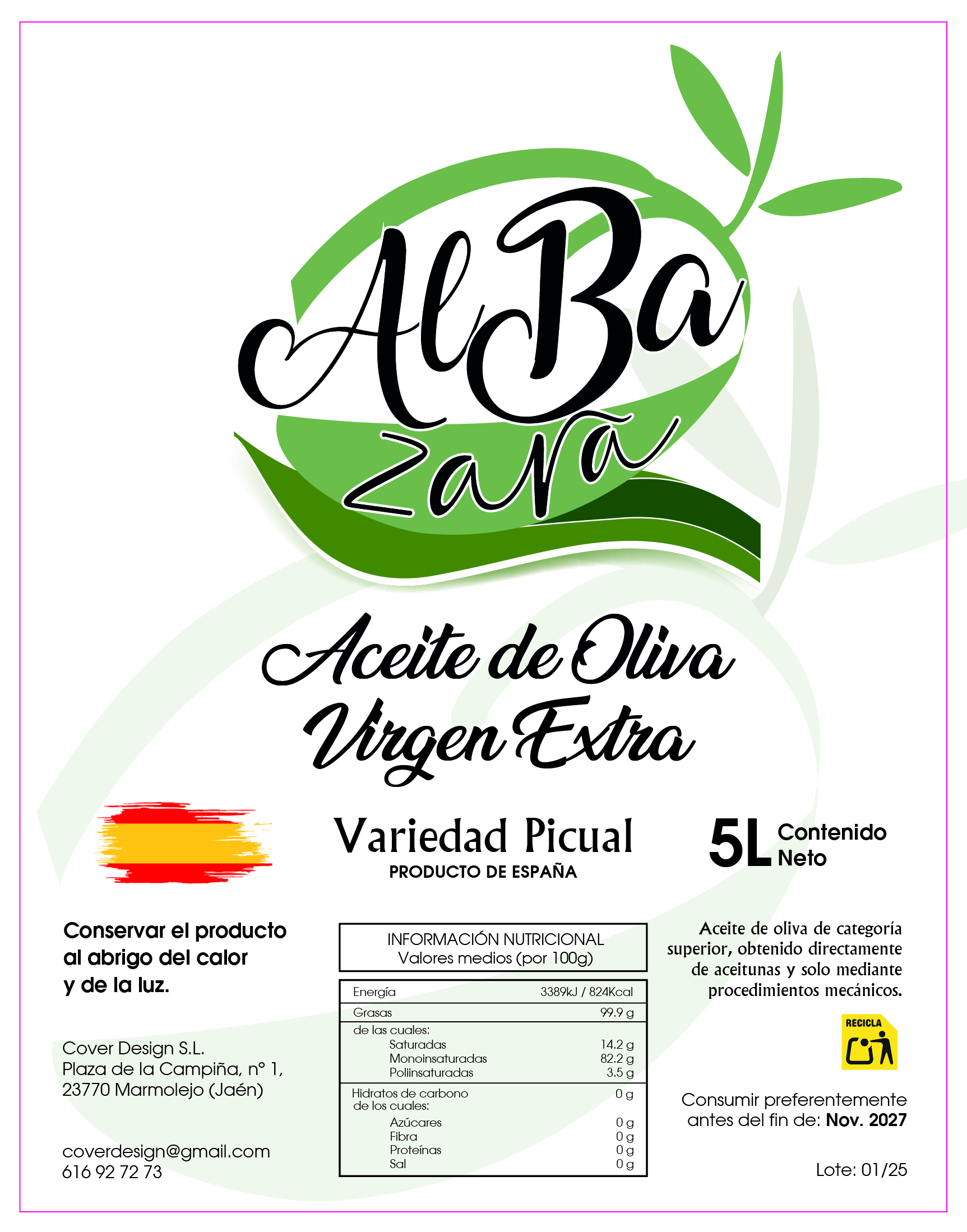 Gran formato familiar y de ahorro o para uso en grandes cantidades, cantidad de 5 litros. Todos nuestros Aceites de Oliva Virgenes Extra proceden del zumo de la aceituna que recolectamos de olivares propios. Todo el seguimiento y cuidado es llevado a cabo por personal cualificado y educado en el cuidado medioambiental. La base principal de un buen Aceite de Oliva Virgen Extra está en el cuidado del suelo y el árbol que sustenta la aceituna: el olivo.